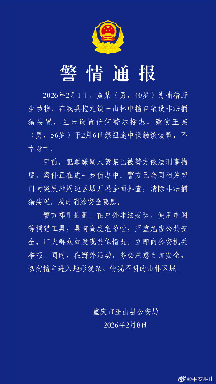 重庆市巫山县公安局通报,2月1日,黄某(男开云sports,40岁)为捕猎野活泼物,在巫山县抱龙镇一山林中私自架设作恶捕猎安设,且未成立任何警示记号,以致王某(男,开云体育官方网站56岁)于2月6日祭祖途中误触该安设,祸害身一火。现在,作恶嫌疑东说念主黄某已被警方照章刑事拘留,案件正在进一步侦办中。警方已会同接洽部门对案发地邻近区域开展全面排查,拆除作恶捕猎安设,实时排斥安全隐患。