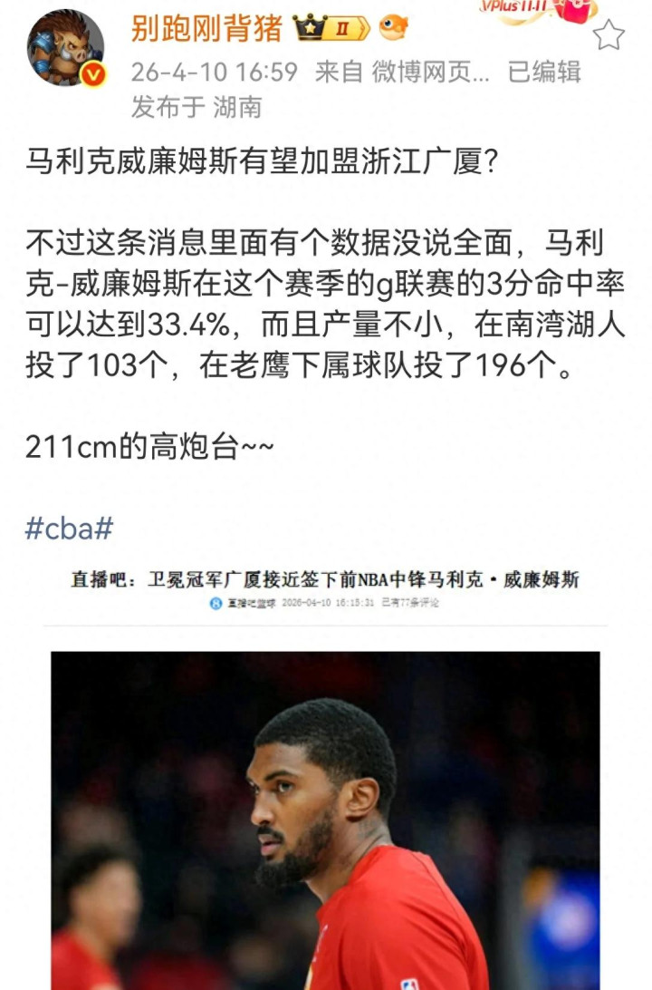 本年28岁的马利克威廉姆斯,身高2.11米,臂展2.21米,4月10日代表NBA发展定约南湾湖东说念主主力打季后赛,季后赛实现,他如故成为目田球员,正在办理签证。G联赛场均15.4分 9.5篮板 1.3盖帽,射中率58%,三分34.2%。护框出色、篮板才能强、移动才能优于传统中锋,2.21米臂展提供顶级护框威慑,协防补位泄露好,能有用约束对方内线,能内能外,挡拆顺下吃饼才能凸起,中距离和三分有一定要挟,具备基础接应才能,广厦针对性补强,处理了球队内线身高不及、护框薄弱的问题。