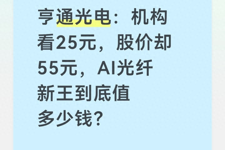 小区里的老股民周叔,最近天天蹲在便利店门口聊亨通光电,愁得烟皆抽得勤了。他旧年年底42块独揽起初的这只票,沿路拿着涨到面前55元,账面浮盈看着挺喜东谈主,可翻了几份机构研报之后,平直犯了难。有的机构平直给指标价25元,说估值虚高赶快跑;可头部券商又喊着看70、80元,说它是AI光纤的龙头,改日空间大得很。