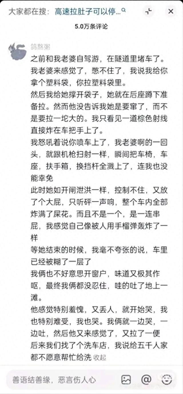 网友共享自驾囧事:配偶俩赶路,浑家短暂腹痛难忍,车流依样葫芦,连救急车谈齐挤不进。几分钟后,浑家红着眼说“确实不可了”,下一秒,成年东谈主最心事的社死现场,在褊狭车厢里发生。