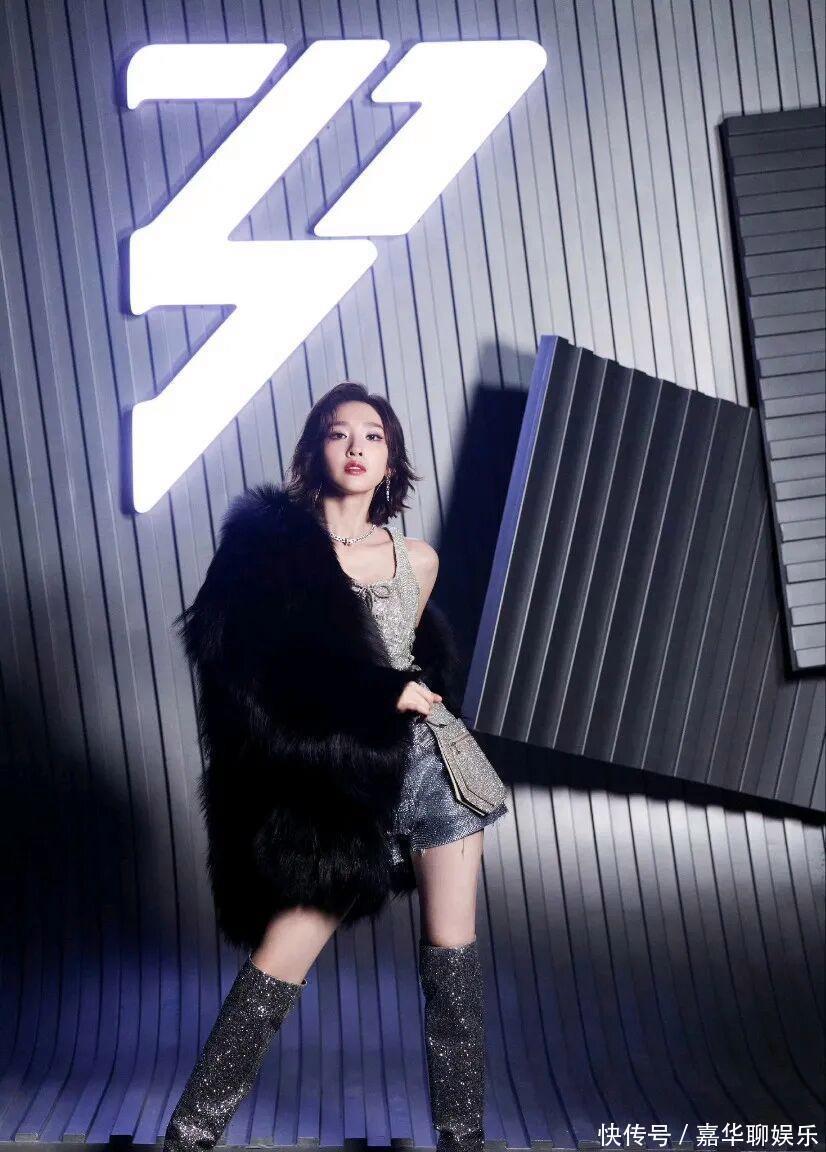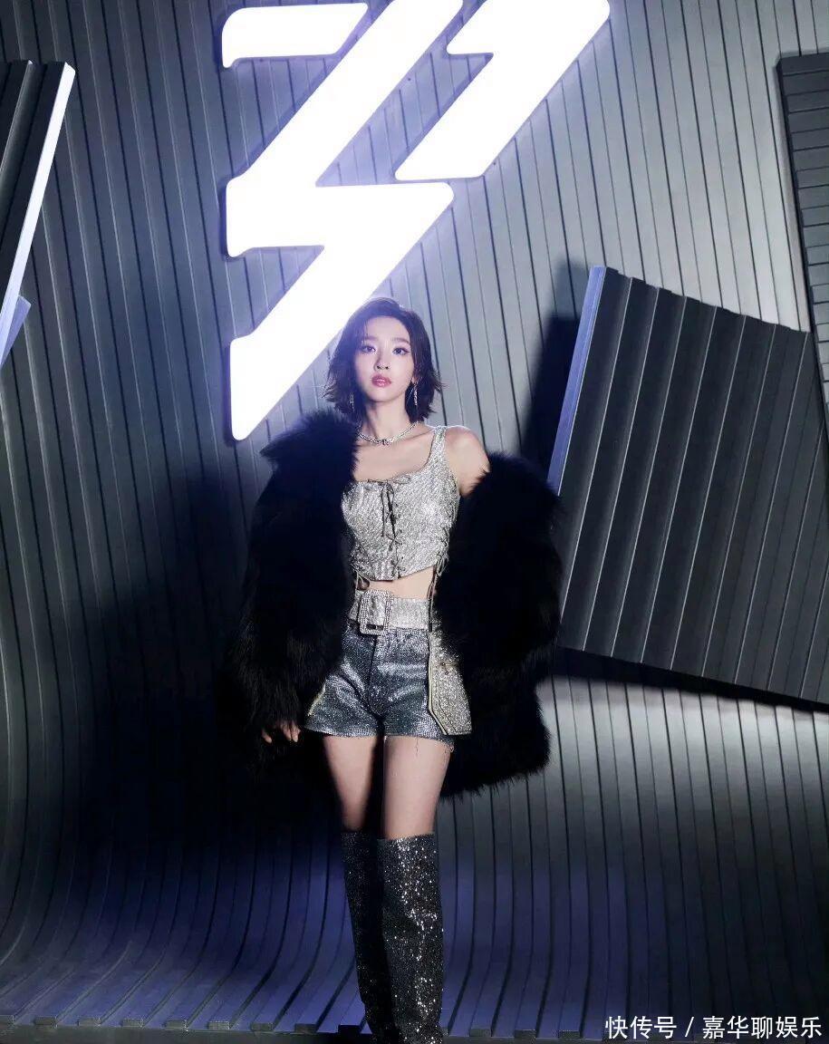 银色亮片绑带短款吊带,搭配同系列亮片高腰短裤,外搭一件玄色环保皮草外衣,脚踩同色系亮片过膝长靴,宽腰带收紧腰线,整套造型闪度拉满,又野又贵,把甜酷风玩到了极致。