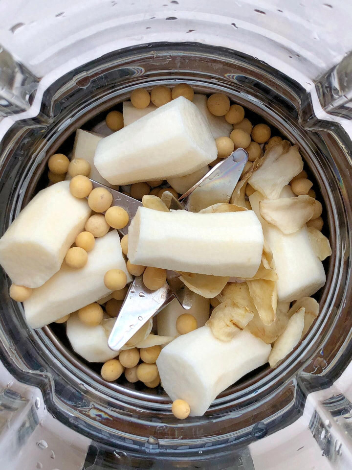 黄豆提前泡两小时,山药去皮切块(牢记戴手套,否则手会痒)。然后把通盘材料放进破壁机,加700毫升水,按豆乳键等着就好。