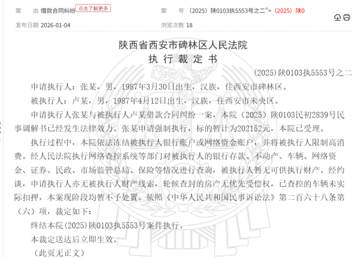 记者从中国裁判文告网查询到,《碑林区法院推论裁定书》[(2025)陕0103捏5553号之二]表露,2025年12月15日,张某苦求强制推论,被推论东说念主卢某,方向暂计为202152元,本院已受理。