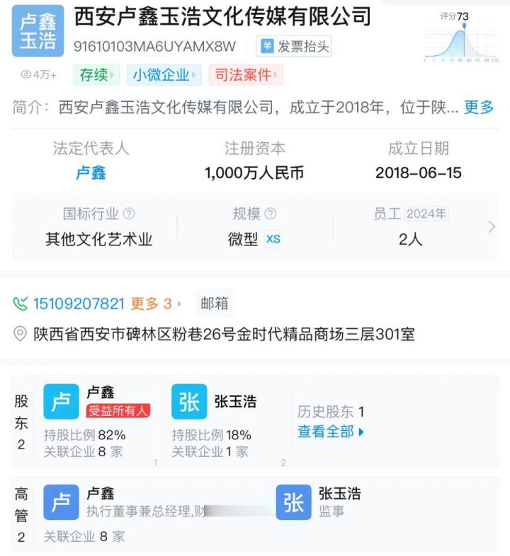 天眼查表露,2018年6月15日,卢鑫与张玉浩建造西安卢鑫玉浩文化传媒有限公司。