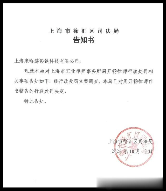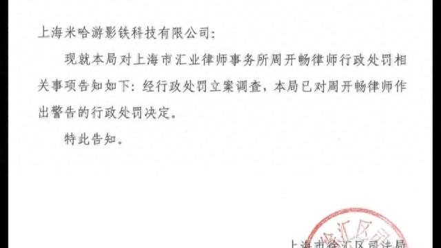 上海市汇业讼师事务所管委会委员、高等结伙东谈主周灵活讼师已被上海市徐汇区法则局作出行政处罚。