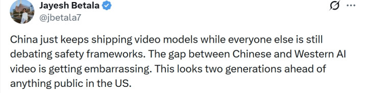 在Mac出产力社区小知名气的袖珍独处配置者dashpane.pro前创举东谈主更是直言:“中好意思AI视频时候的差距仍是大到有些无语。中国这些模子的水平,看起来比好意思国悉数公开可用的同类时候首先了整整两代。”