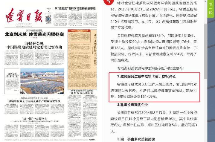据报说念,这是2025年10月21日至2026年1月16日,辽宁省委查察组对省住房和城乡成就厅党组开展的专项查察时发现的一皆案例。官方定性是吃拿卡要、以权略私。王某某被禁受了什么门径,受到了什么处理,当今并无笃定露馅。