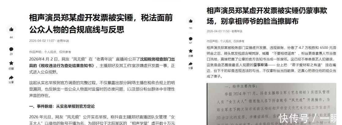2026年4月2日和3日,自媒体博主“老后生说”招引发布两篇著述《相声演员郑某虚建立票被实锤,税法眼前公世东谈主物的合规底线与反想》和《相声演员郑某虚建立票被实锤仍蒙事欺场,别拿祖师爷的脸当擦脚布》,曝光了德云社演员郑某存在的发票和税务问题。