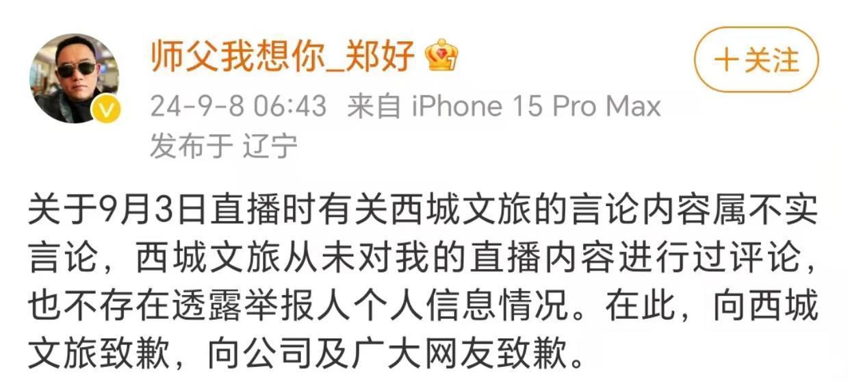 别忘了,这可不是郑好第一次给德云社抹黑,之前他曾在直播间里夸口说西城文旅向他泄漏举报东谈主信息,在自媒体博主“丰昌评话”举报到西城文旅之后,郑好被迫公开向西城文旅谈歉。