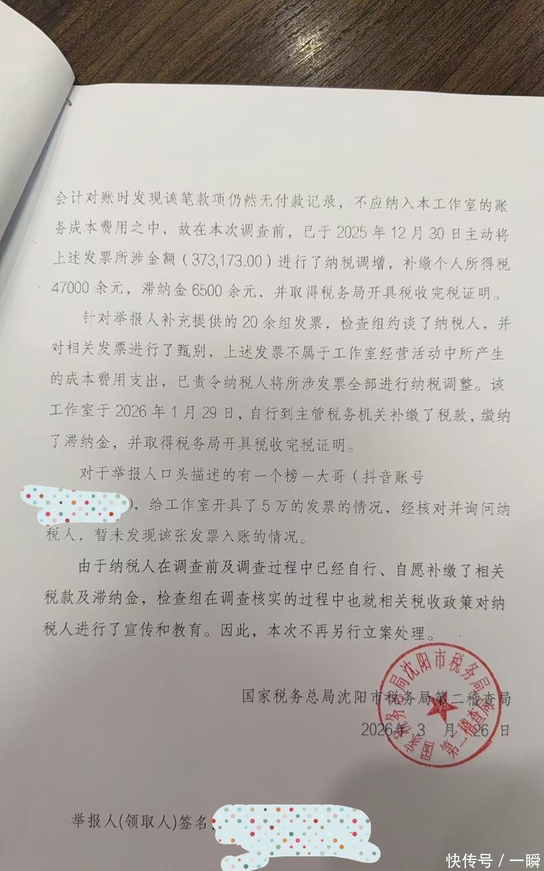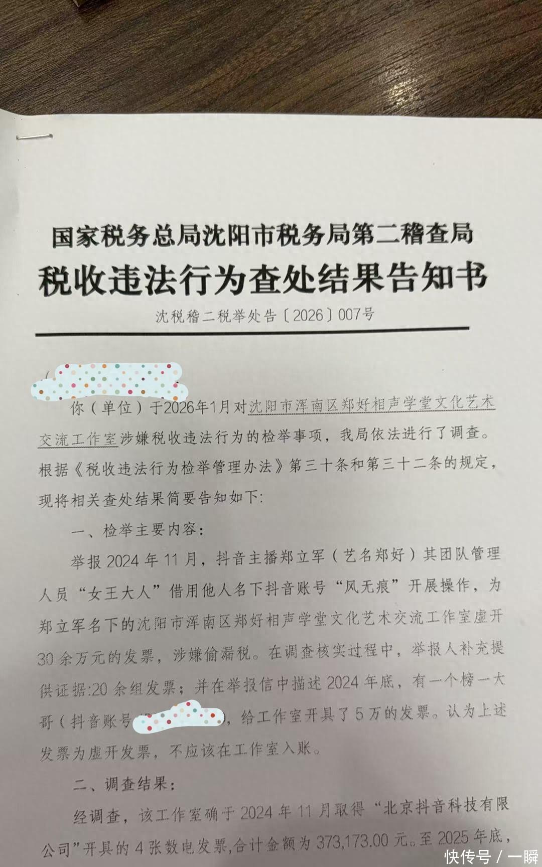 见知书实践线路,这次被查处的是沈阳市浑南区郑好相声学堂文化艺术探究责任室,打听时辰是2026年1月,查处的原因是有东谈主举报,2024年11月主播郑立军(艺名郑好)其团队搞定东谈主员“女王大东谈主”借用他东谈主名下账号“风无痕”开展操作,为郑立军名下的责任室虚开30余万元的发票,涉嫌偷漏税。