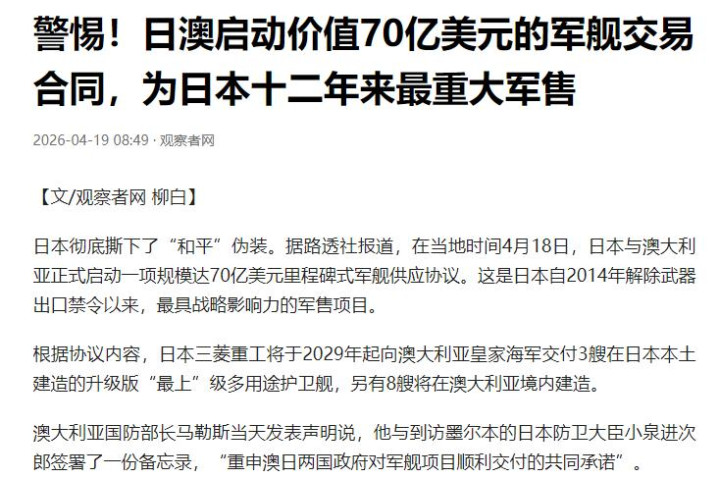 就在日本战船过航台海的第二天,凝视大臣小泉进次郎就迫不足待地跑去澳大利亚,班师敲下了一笔价值接近1000亿元东说念主民币的11艘护卫舰大单。这吃相,的确是把“思赢利思疯了”写在脸上。